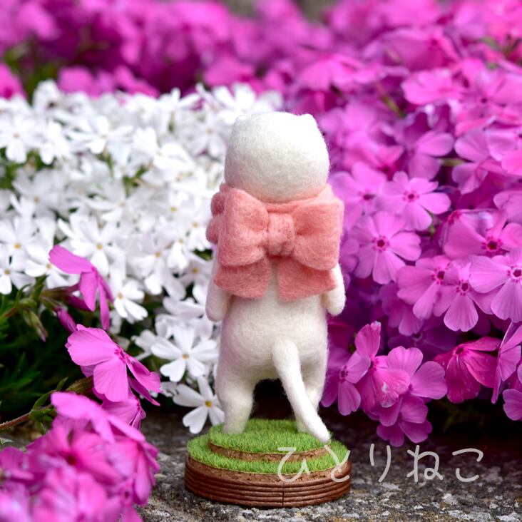 ピンクのマフラーを巻いたオッドアイの白猫さん。少し背が小さい(当社比)